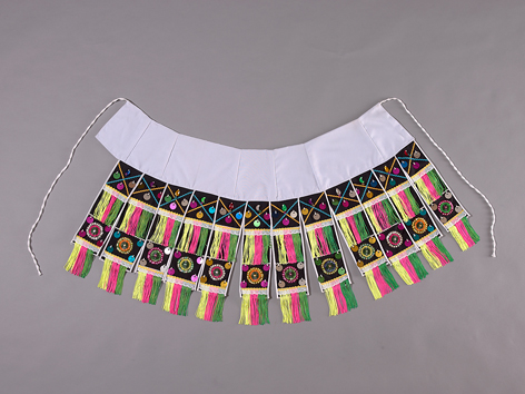 此件流蘇裙係以一片長條形白色布條作為腰帶,並在布面上打上六處皺褶使其呈現圓弧狀的樣式,左、右上方兩角接縫一條白色綁繩。白色腰帶下方貼縫十二條長度、大小相等之長方形白色布條流蘇,正面貼縫黑色布片,並以曲折形紋細布條、塑膠亮片、塑膠管珠花朵、蕾絲邊、以及桃紅、黃、綠三色毛線流蘇為飾。