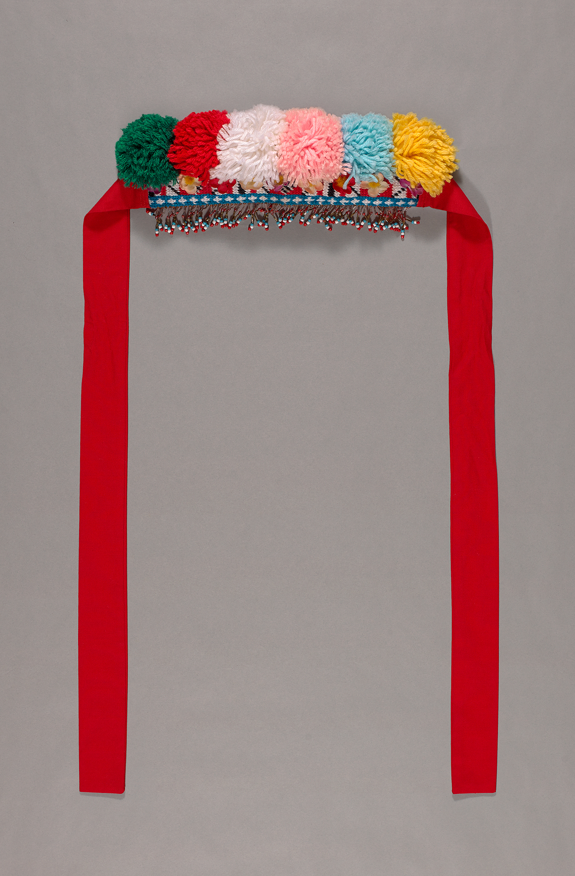 本件為額帶係以一件長條形的織布左、右兩端接縫細長的紅色布片綁帶為底。此件織布位於額帶中央作為主飾,係以黑、白、紅、藍等色線織有線條形、菱形、箭頭形等幾何圖形組合,並在中央橫向縫綴九朵布製小花朵,織布上方縫綴墨綠、紅、白、粉紅、淺藍、黃等色之毛線絨球,下緣縫綴一排珠串流蘇,係以紅、白、藍及透明管珠串成。
