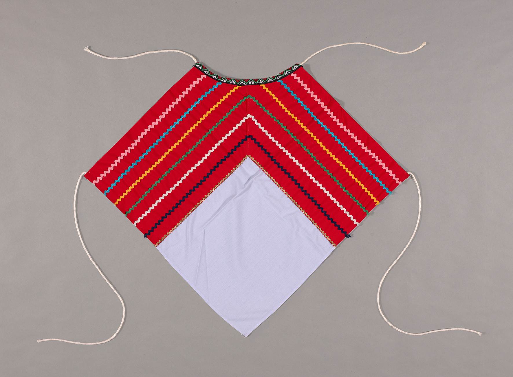 此為一片以白色布片為底,裁剪成近似菱形的五角扇形樣式之女子胸兜。將一片紅色寬面布片沿著胸兜上方邊線凹摺貼縫於胸兜的上半段,下方留有菱形白色底布,並以一條菱形繡帶長邊對摺使其呈現相連三角形圖案樣式於胸兜上緣緄邊。此片紅布共貼縫七條曲折形紋圖案,從外至內分別為粉紅、藍、黃、綠、白、藏青、金等色。另在胸兜上方、兩側共四角處再接縫白色綁繩。