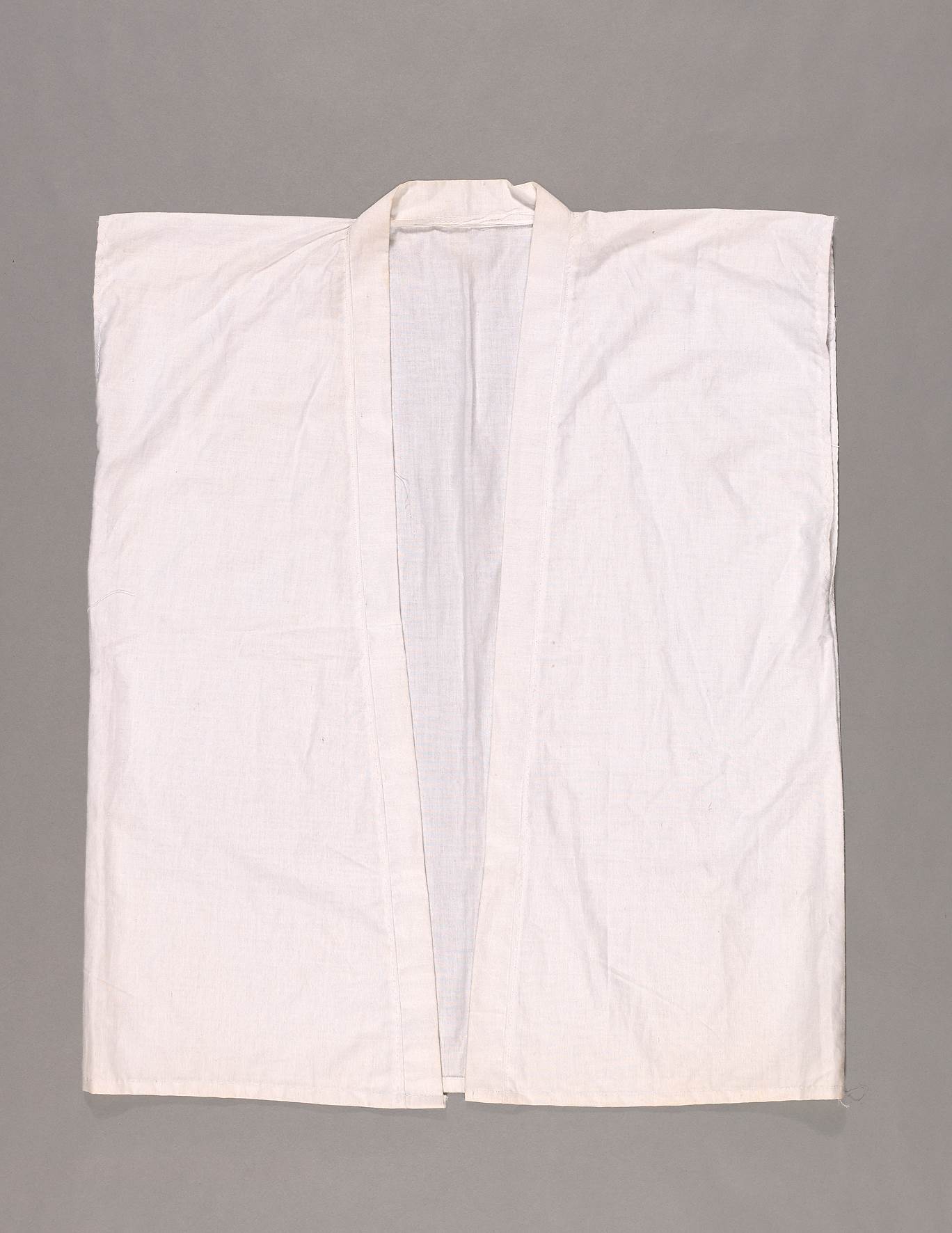 此件上衣全件以白色布料剪裁縫製而成,在衣身兩側袖圈處向下縫合,類似貫頭衣之形制,但有開前襟。另在領口、前襟處在接縫同款白色布條使其成為立領樣式。再將兩袖圈及衣身下襬車縫修飾邊緣。整件服飾呈現對襟立領無袖上衣。