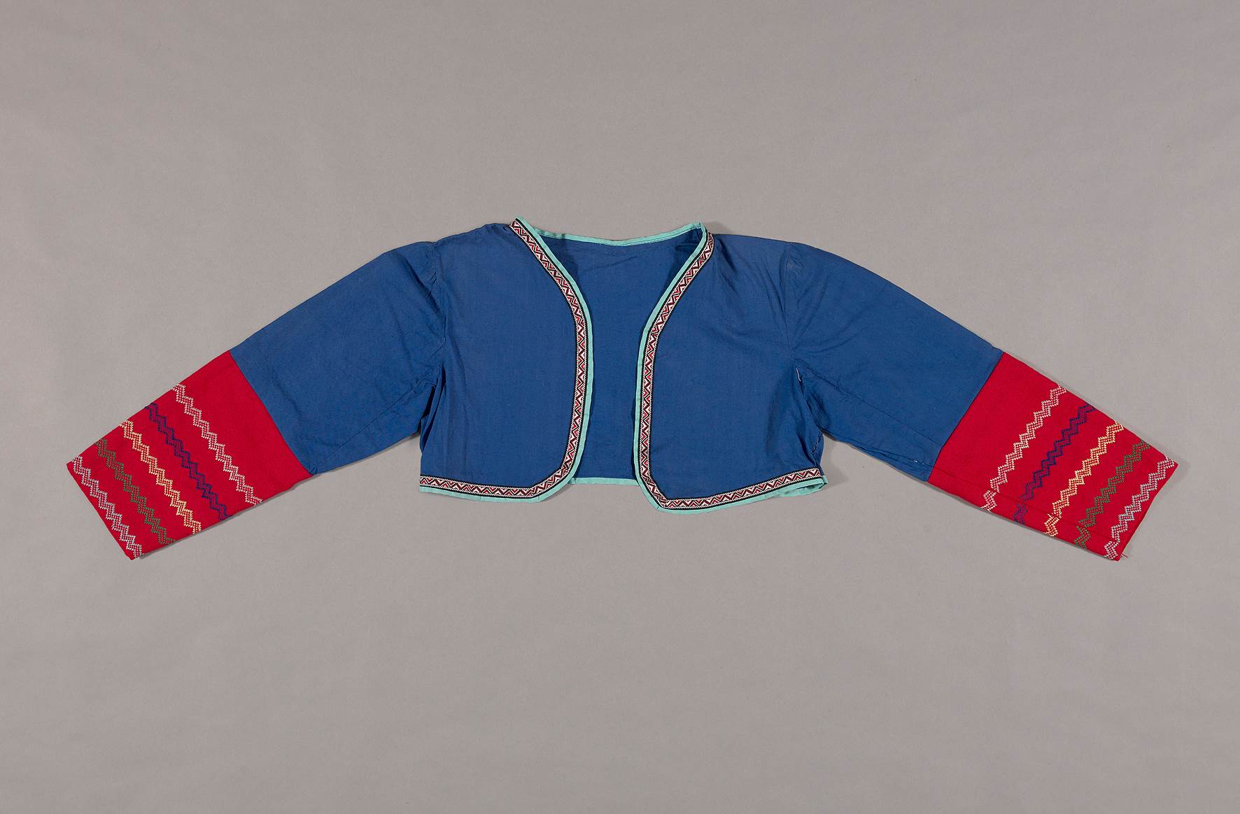 此為一件以藍、紅兩色之布料所剪裁縫製而成的女子對襟長袖短上衣,藍布作為衣身和上臂、紅布為前臂至袖口。以水藍色細布條於領口、前襟及下襬處緄邊,並於領口、前襟處貼縫一條紅、白、黑三色的曲折形紋繡帶。兩袖口往內側以十字繡法陸續繡有五道彩色曲折形紋圖案,依序為淺藍、綠、黃、深藍、白等色,此種圖案亦有採用曲折形紋布條貼縫的裝飾方式。