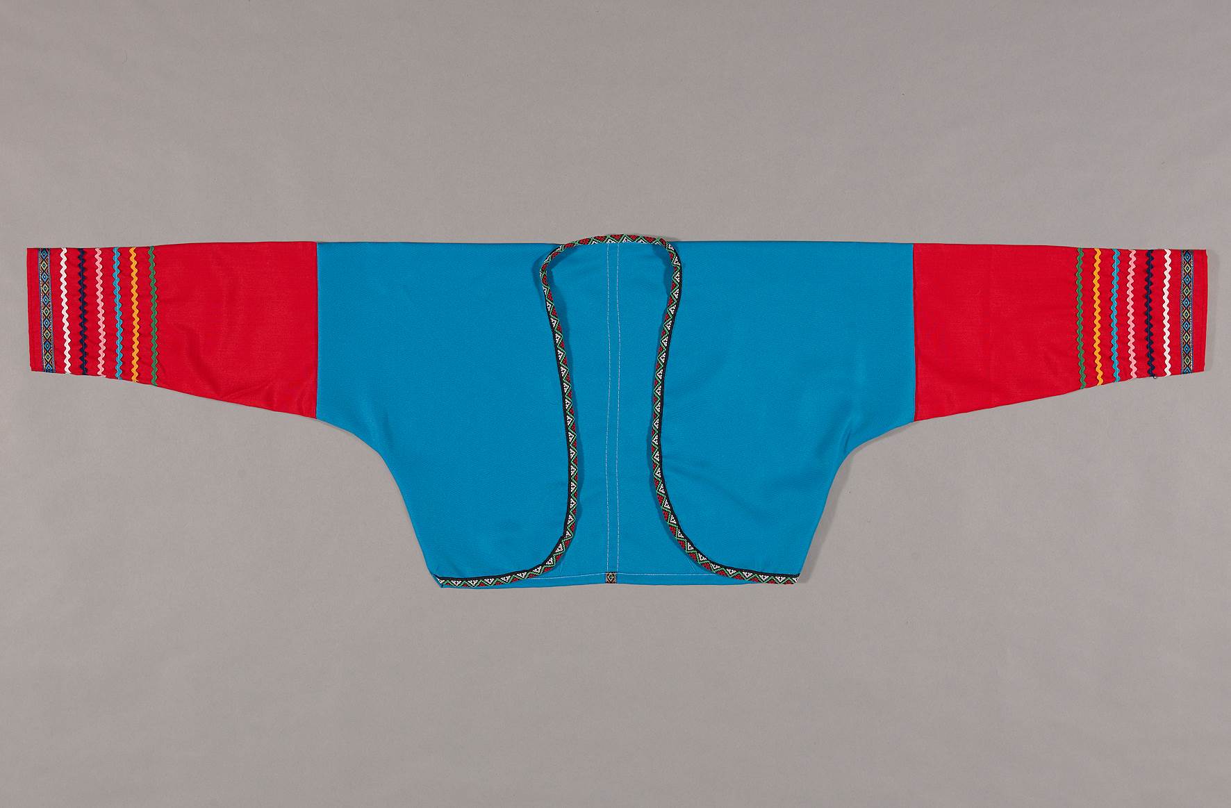 此為一件以藍、紅兩色之布料所剪裁縫製而成的女子對襟長袖短上衣,藍布作為衣身、兩手臂至袖口處為紅布。將一條細長的菱形紋繡帶從長邊對摺方式於領口、前襟及下襬處緄邊,使其呈現三角形和曲折形紋的花紋,色彩為紅、黑、白、綠等色線。另於衣身背面中央貼縫另一種款式之菱形繡帶。兩袖從袖口往內陸續貼縫彩色菱形紋繡帶、白、藏青、粉紅、淺藍、黃、綠等色之曲折形紋細布條。