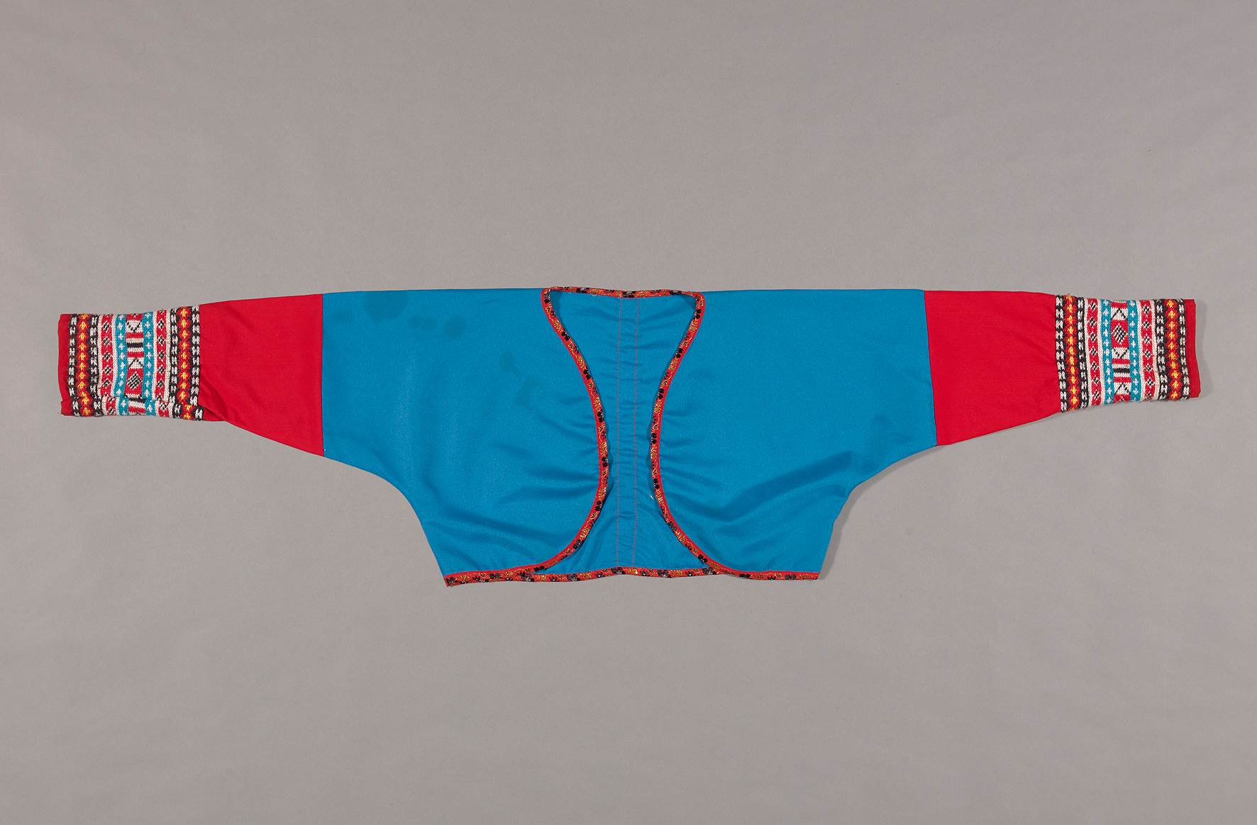 此為一件以藍、紅兩色之布料所剪裁縫製而成的女子對襟長袖短上衣,藍布作為衣身、紅布為手臂至袖口。以細長的繡帶於領口、前襟及下襬處緄邊另縱向貼縫背面中央,此繡帶以紅布為底,上方以黑、白、金色三線繡有花葉形紋。兩袖口貼縫一片寬面織布,織紋圖案為虛線紋、菱形紋、線條形紋、短橫線紋等幾何圖案組合,織線有黑、白、紅、黃、藍等色,此種圖案與男子胸兜織紋相同。此外,兩袖口亦有採用布條貼縫的裝飾方式。