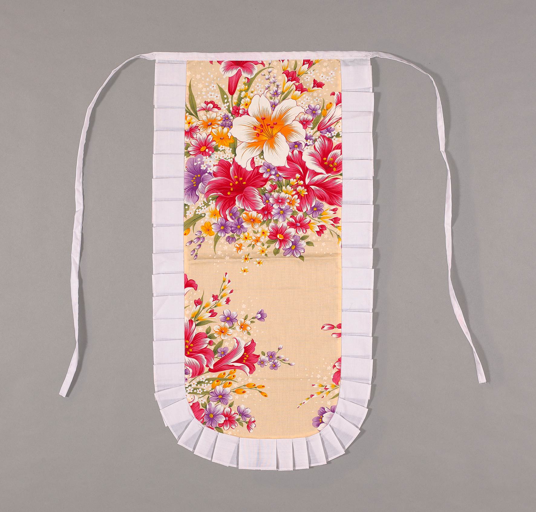 此件圍裙以橙色為底的印花布製成。此印花布剪裁成圓角縱長型之樣式,圖案以百合花為主,另以紫、桃紅、橙、白等其他花葉為輔。另以打摺之白色長布條車縫於此印花布左、右、下方三邊為飾,再以一條細長白色布條接縫於圍裙上緣,多餘長度作為綁帶。