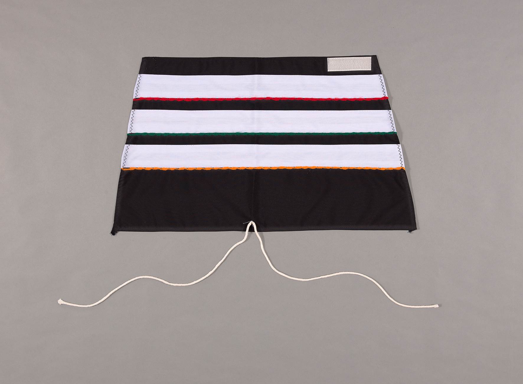 綁腿又稱為護腿布或護腳布,以兩件為一組,因此本件須搭配館藏編號M108601穿著,分別包覆於左、右兩腿之小腿至腳踝處。本件綁腿以一件略為方形的黑色布片為底,上方中央縫有一條白色綁繩,下方貼有魔鬼氈。布面正面中下方橫向貼縫三片長方形的白色布條,並在每片布條上方分別縫上橙、墨綠、紅色毛線為飾,白色布條兩側邊為黑色曲折形紋縫線。