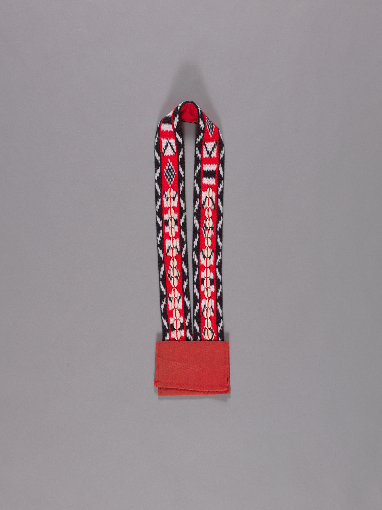 本件火器袋可分為背帶以及下方皮袋兩部分。皮袋為方形形制,袋身較小,原應全件以獸皮製成,本件則採用色澤相近的紅褐色布料所製,並以紅線縫合。袋身後方接縫一條細長織帶作為背帶,此背帶正面以紅、白、黑三色線織有線條形紋、斜線紋、方形紋、菱形紋、箭頭形紋,並在織帶後方貼縫一片紅色布片,並在背帶兩端中下段部分,各縫綴一排子安貝為飾。